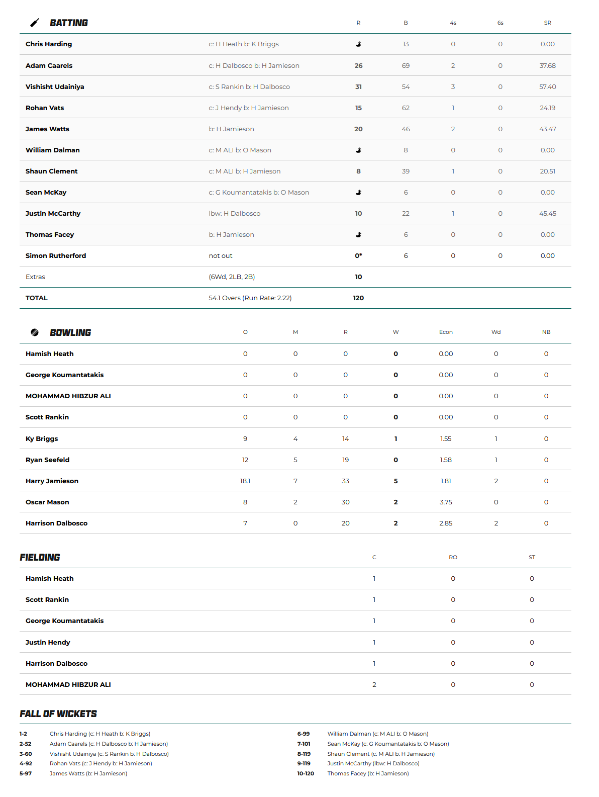 The scoring was very slow early as Briggs and Seefeld were keeping things very tight. The first wicket fell at 1/2 after 4.1 overs with a slips catch to Heath. From there, the opposition consolidated, compiling a patient 50-run partnership over the next 16 overs before Jamieson broke through for the first of his Michelle with Dalbosco taking a much-needed.